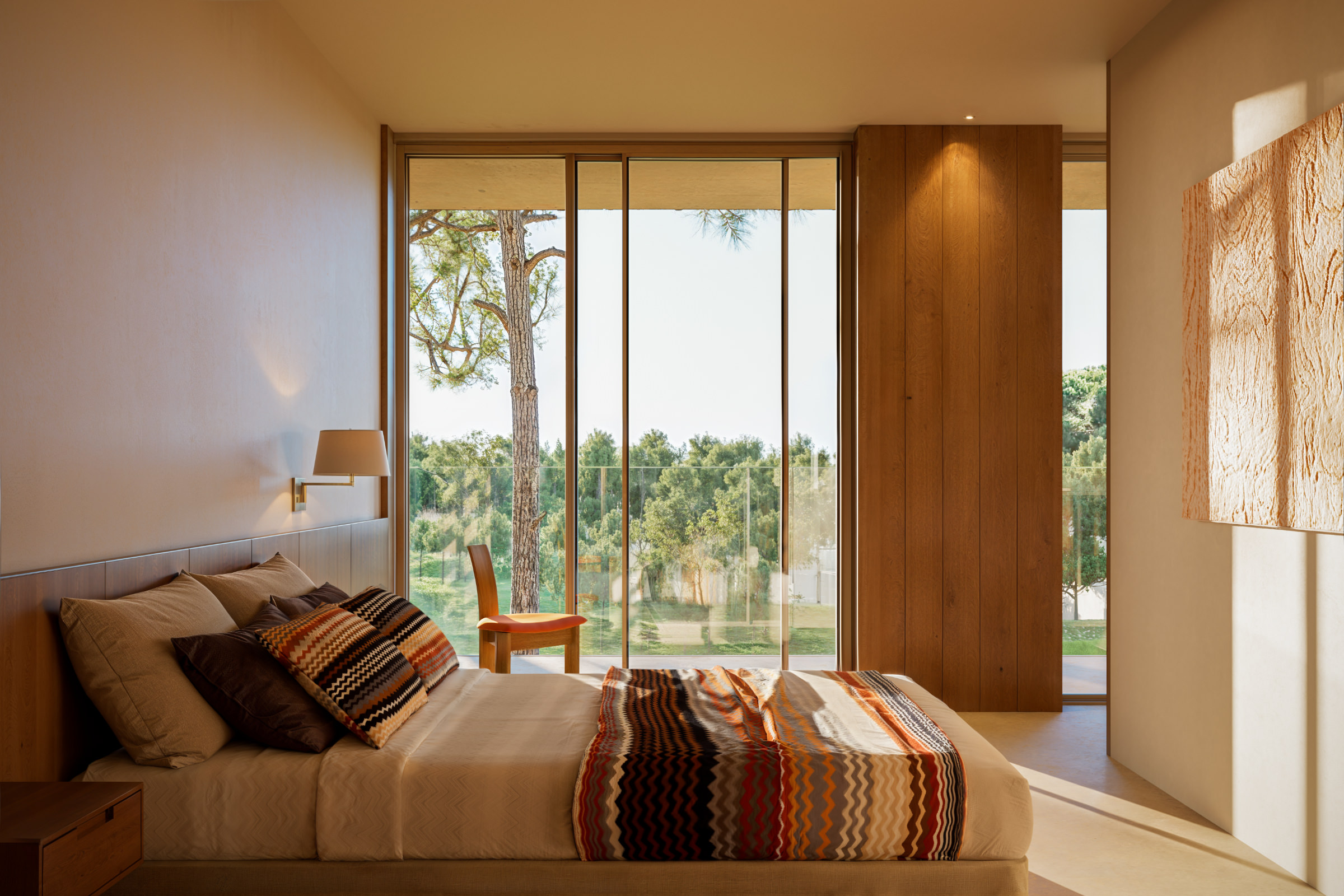 The development sits inside Herdade da Aroeira, a historic 350-hectare estate near the dunes and beaches of the Atlantic coastline. Instead of forcing a design language onto the site, the architectural strategy works with the land’s existing slope, canopy, and light. Buildings sit low among the pines, finished in stone, wood, and other natural materials chosen for their ability to weather gracefully under salt air and sun. It’s a quieter approach than one might expect from Missoni, but that’s the point: the landscape leads, and the brand extends it.