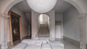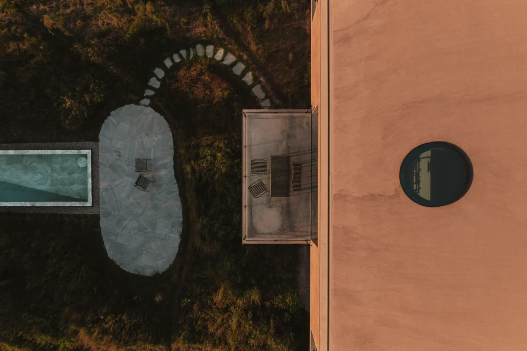 At first glance, the house reads as pure form, with elemental shapes arranged with surgical precision across the sloping terrain. But the geometry isn’t arbitrary. A series of circular skylights, designed precisely within the structure using a 3D model, allow light from the main skylight to cut through the house, reaching spaces that would otherwise sit in shadow.
